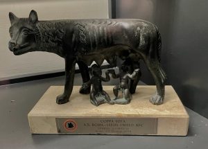 This is what is called a hospitality trophy / gift. We have dozens of these in all shapes and sizes in our archive. Some are very valuable indeed. These items have not been actually won but are gifts that are usually exchanged at lunch/dinner the day before the game, when officials from both clubs meet up. This particular image was given to Leeds United by AS Roma. Leeds United and AS Roma have played against each other four times in the UEFA Cup (1 win and 2 draws). So we have 4 of these particular statues, 3 in archive (they should all be on display) and this one which is on display in The West Stand at Elland Road. The trophy / gift that Leeds United used to present to other clubs (during international tournaments) is a bronze statue on a polished wooden base of The Black Prince (Prince Edward of Woodstock), the reason we use this particular item is because it is the main statue in the middle of Leeds City Centre. I have a tale regarding our Black Prince gift, that I will tell one day.